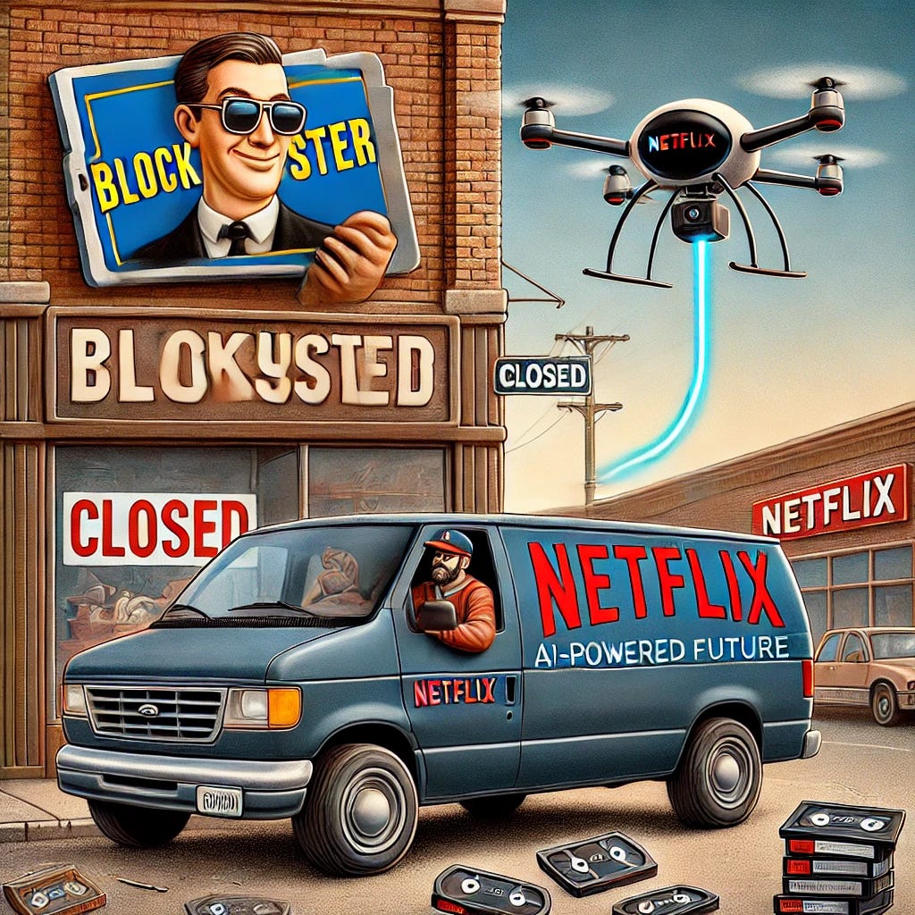 The same principle applies here: AI is your Netflix moment. Will you stream along or become the next Blockbuster?